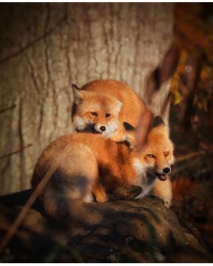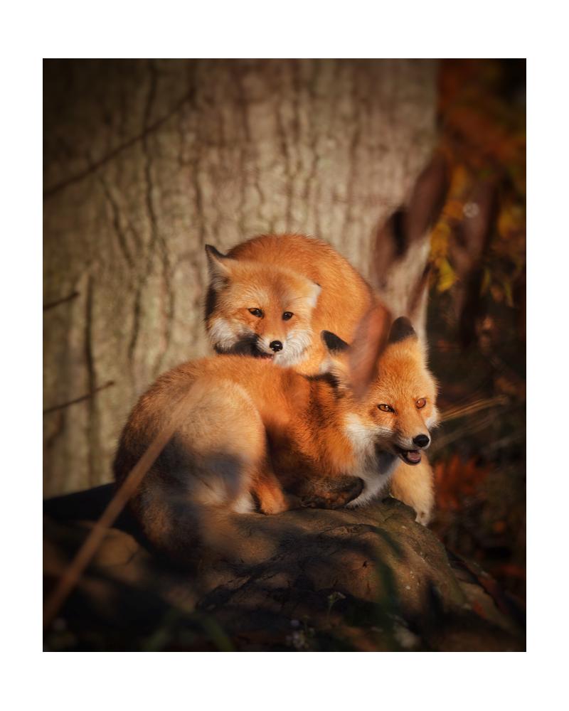 Two New England Fox siblings hang out with eachother during a Fall 2022 sunrise.